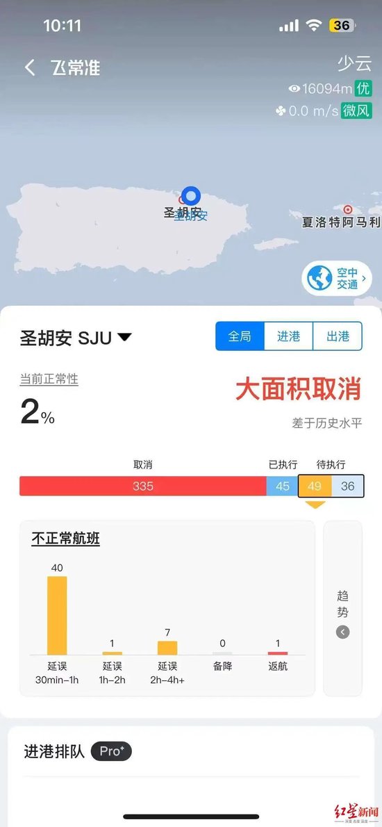 波多黎各旅游局执行主任威廉内特·罗布尔斯·坎塞尔在一份声明中表示,波多黎各旅游官员一直在与航空、邮轮和住宿行业通力合作,以“负责任且有序的方式”应对当前局面。声明还指出,在航空运营恢复正常之前,相关部门正持续努力为受航班取消影响的旅客寻找酒店住宿和其他替代方案。目前信息显示,波多黎各圣胡安机场的航班正常率仅2%。