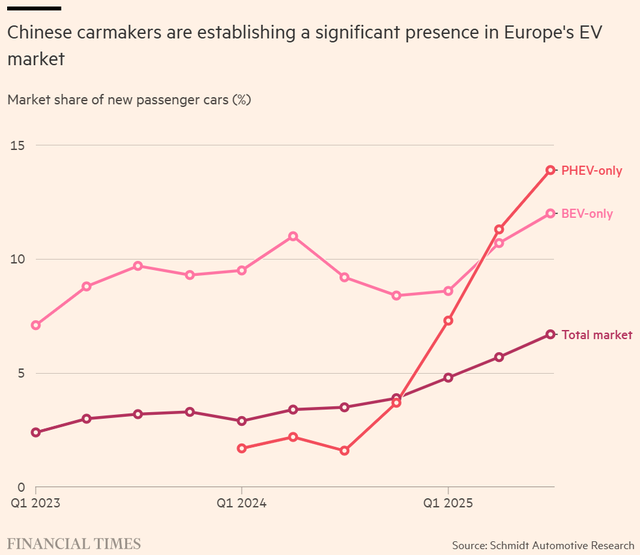 《金融时报》的图表也显示,中国车企的PHEV车型在欧洲的市场份额自 2024年第三季度起快速攀升。