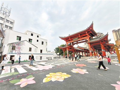 隔海花桥街区升级改造项目地处上隔海村,工程历经四个月全部竣工。工程涵盖牌坊改造、通道墙面翻新、广场周边居民楼立面翻新、新建文化驿站(社区书吧)、新建雕塑亭、新建观景休息平台、祈福池改造、河道两岸绿化景观改造等多个板块,全程坚持不拆建、不迁移的轻介入策略,仅通过墙面、地面、檐下三个界面植入文化符号,最大限度减少对居民生活的干扰,保留原有生活轨迹。“如今的街区容貌焕然一新,居民生活环境显著改善,新建的文化驿站也丰富了大家的精神文化生活。”钟雄峰表示,通过此次改造,市民能更直观、深刻地了解花桥文化,街区也成为吴川又一张亮眼名片。
