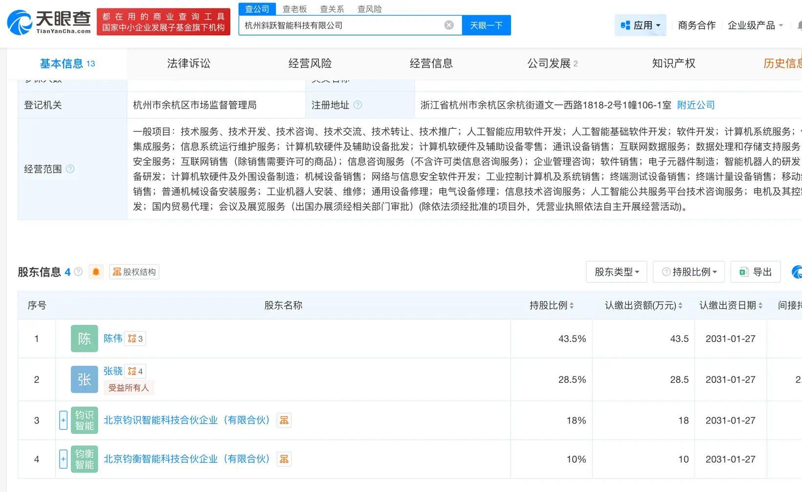 资料显示,斜跃智能成立于2026年2月,由北京、杭州、深圳三家主体公司构成,法定代表人均为张骁,注册资本各100万元。